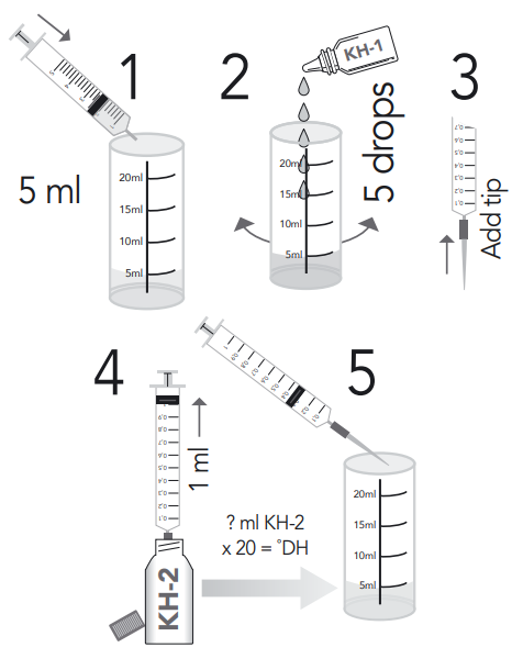 5. Multiply the amount of KH-2 test fluid in millilitre what was needed to let the colour convert from blue to yellow by 20 to calculate the KH in ˚DH. Or use the chart in this manual.